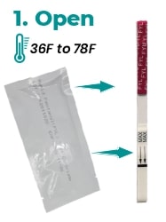 1. Öffnen: Entfernen Sie den hCG-Teststreifen aus der versiegelten Verpackung oder nehmen Sie einen Streifen aus dem Behälter und verwenden Sie ihn so schnell wie möglich. Für die besten Ergebnisse sollte der Test innerhalb einer Stunde durchgeführt werden.